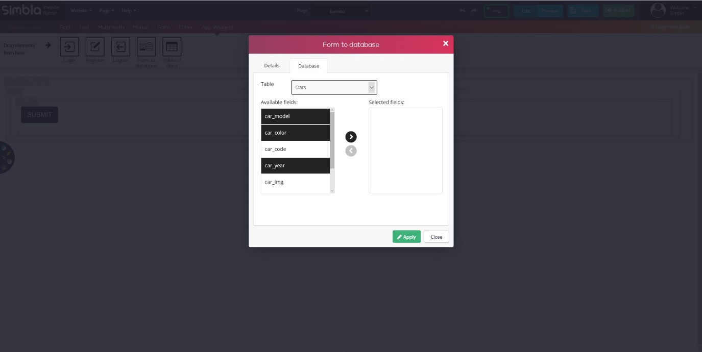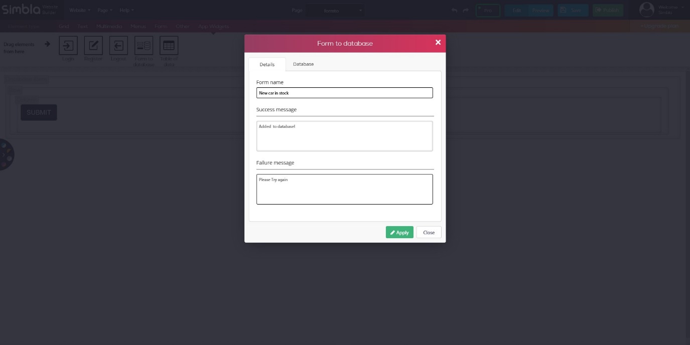 Drag & drop the "form to database" widget, fill in a form name and success/failure message or link to redirect too after sending the form.