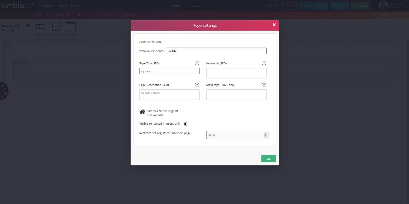 To make the destination page visible only for logged in users, we need to go to page settings and choose "visible to logged in users only" and choose a page to send non registered users to.