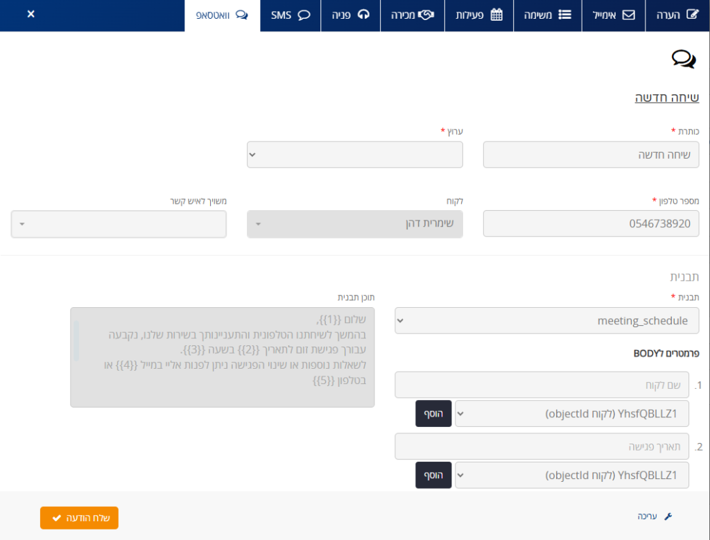לאחר חיבור חשבון וואטסאפ למערכת ניתן לשלוח הודעות וואטסאפ ללקוחות מתוך תבניות המוגדרות בחשבון מטא העסקי.